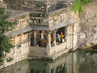 Chitor is filled with monkeys, who gather at your feet waiting to be fed, but don't turn your back on them, because they will happily steal from your rucksack and they are not the charming little animals that you imagine if you have food in there - they will bite! The pictures here show a figure in one of the temples (above left) and one of the many ghats in the complex (above right), with visitors enjoying the view over the water.