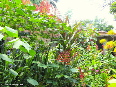 You walk through the garden gates are are met by the most astounding display of lush foliage and colour (above), and every inch of land adjacent to the house is filled to bursting with plants. It's a wonderful sight and as you look closer, you see just how many different plant species there are here. Further away from the house there are swathes of fruit trees - bananas, peaches, oranges and pineapples.