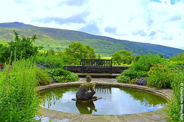 The oldest part of the house dates back to before 1600, but when Sir William arrived here there was just a modest farmhouse standing on an almost treeless hillside. He extended the house northwards, created the terraces to the south of the property to maximise on the views and transformed the traditional Dales agricultural holding into a gentleman's residence fit for a Queen. The first terrace below the house is planted with yew hedges and divided into three rectangular compartments, with a pergola at the far end and a pond in the middle. This strongly axial pattern is repeated on the terrace below. And below the terraces on a gentle gradient, are the red borders, which give a good view of the house above.